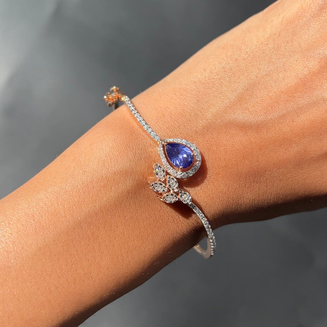 A statement piece that exudes grace and sophistication, this bracelet features a pear-shaped royal blue...