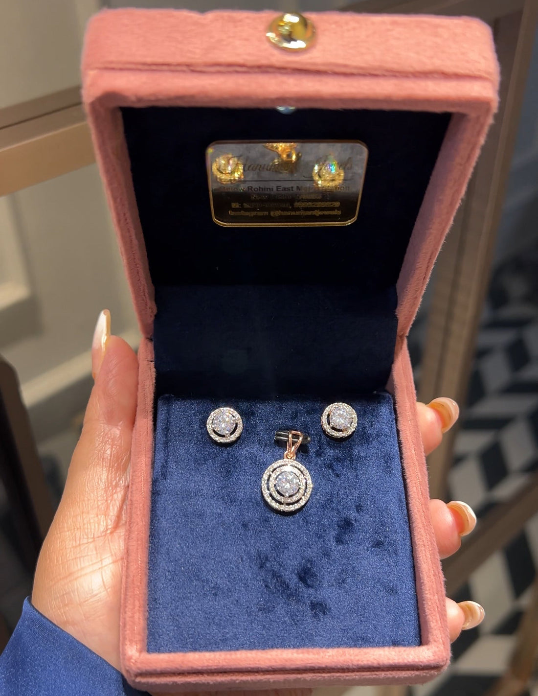 A graceful round pendant paired with matching studs, designed with three radiant halo layers that...