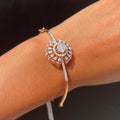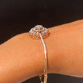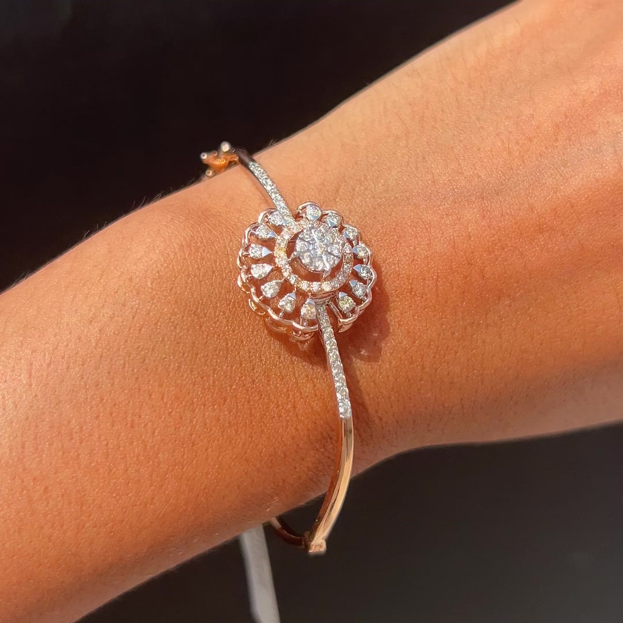 Illuminate your wrist with the brilliance of the Suryika Diamond Bracelet, a stunning piece that captures the essence of celestial beauty. Designed like a blooming sun, its dazzling floral center is crafted with intricately set diamonds that radiate from a clustered core, symbolizing radiance and power. This piece strikes the perfect balance between tradition and modern finesse, making it ideal for festive occasions, weddings, and meaningful gifting.