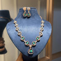 The necklace flows effortlessly along the neckline, culminating in a graceful drop pendant that enhances its overall symmetry. Paired with matching earrings that mirror the same gentle curves and green highlights, this set brings a balanced, sophisticated charm to weddings, festive occasions, and elegant evening wear.