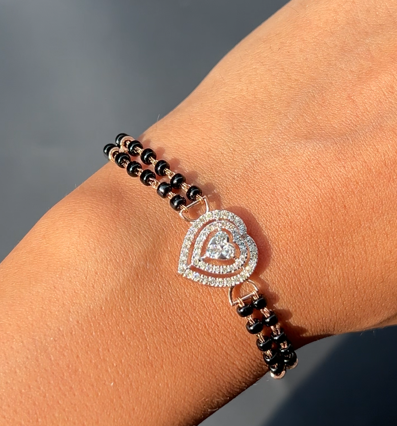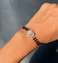 A little romance, a little sparkle, and a whole lot of tradition the Heartspark Diamond Mangalsutra Bracelet is made for the woman who loves wearing her love story on her wrist. Featuring a beautifully layered heart-shaped diamond centerpiece, this bracelet pairs effortlessly with the classic dual-strand black mangalsutra beads, giving it that perfect balance of elegance and emotion.