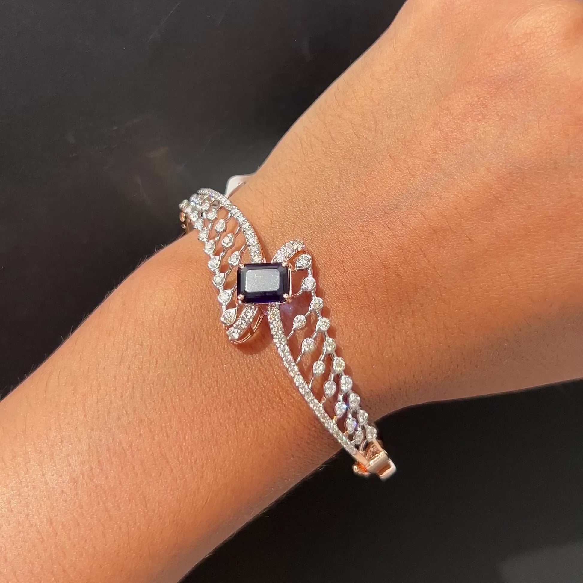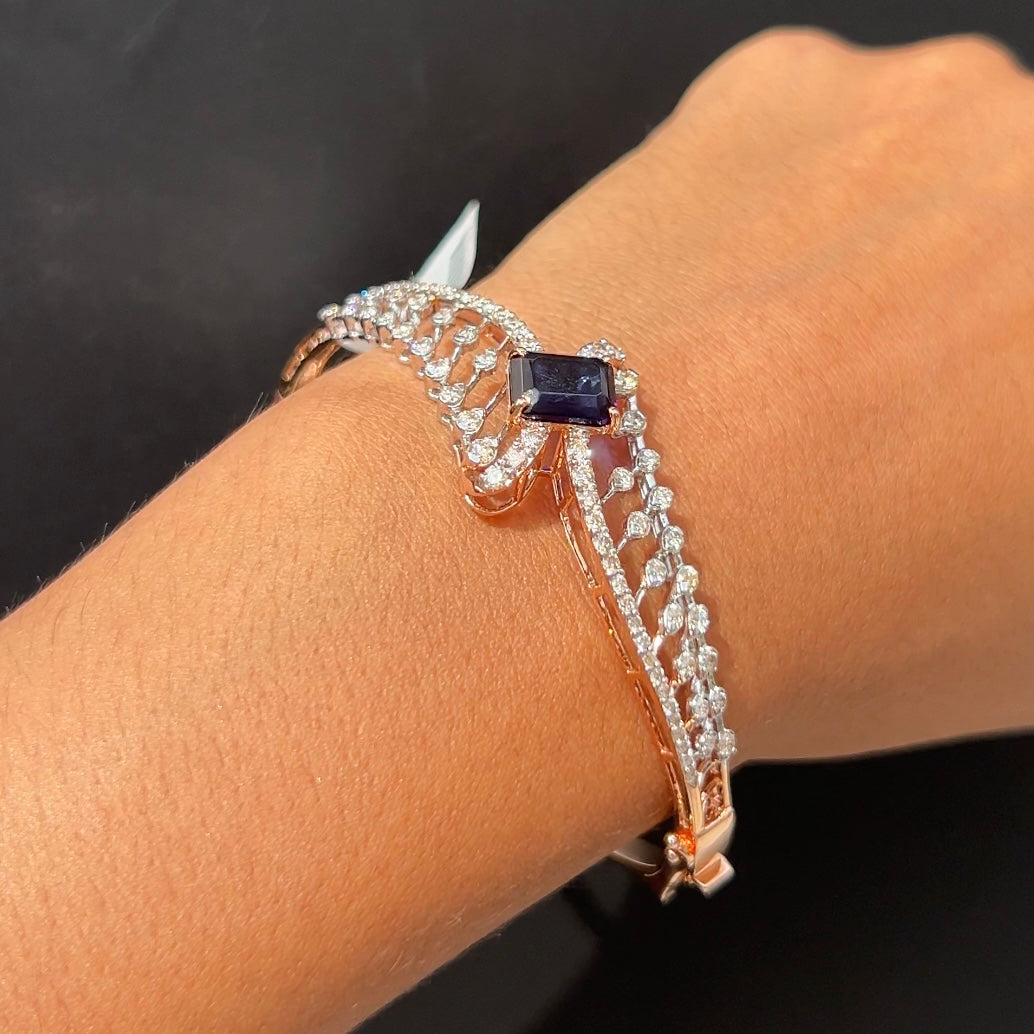 Make a bold yet elegant statement with the Midnight Grace Sapphire Diamond Bracelet. Featuring a stunning emerald-cut deep blue sapphire at its heart, this bracelet is accentuated with a flowing wave of shimmering diamonds on a delicate gold base. The curved design embraces your wrist with sparkle and sophistication, making it the perfect fusion of classic royalty and modern charm.