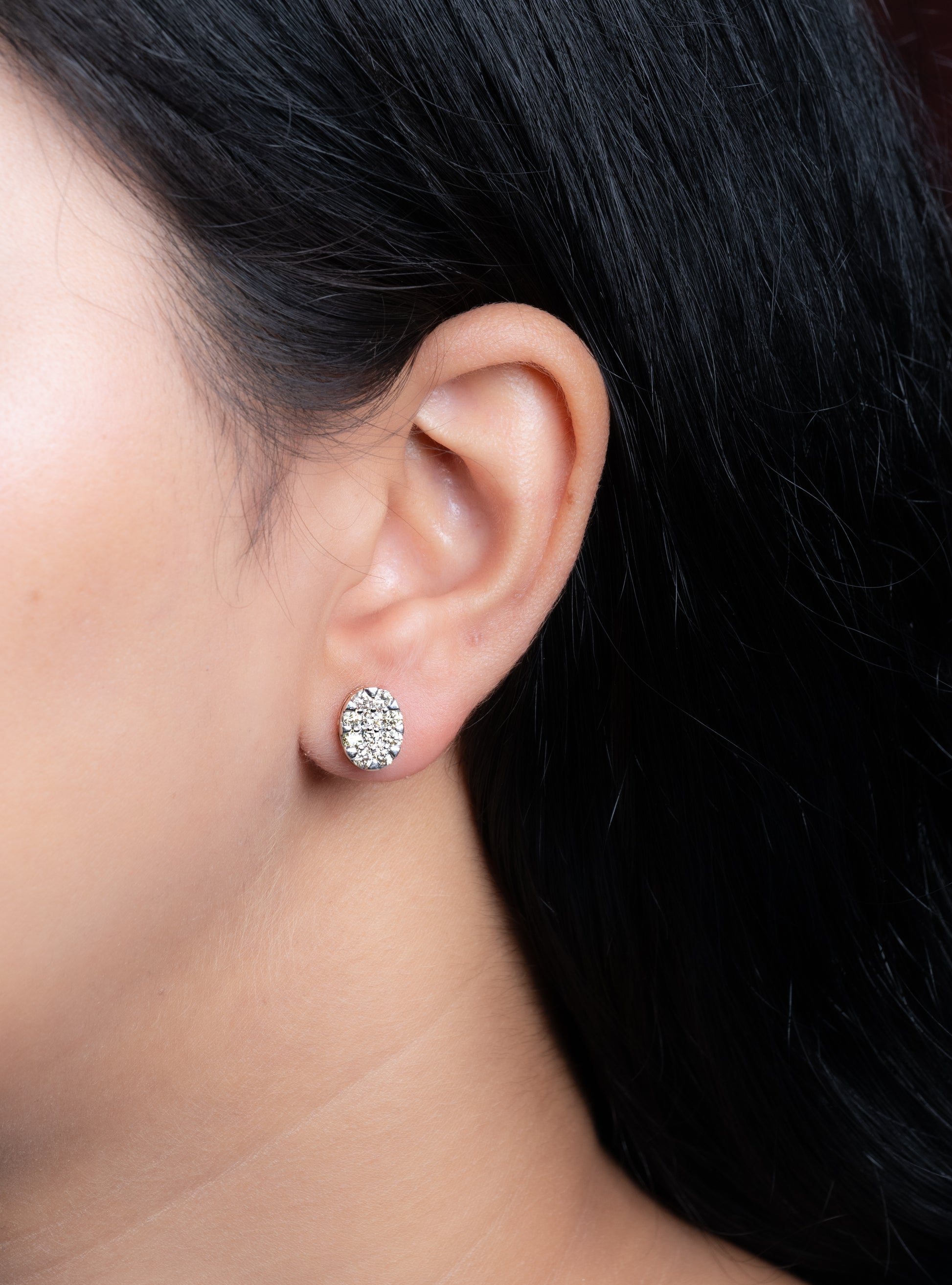 These stunning earrings feature a beautifully crafted oval silhouette, encrusted with a shimmering cluster of round-cut diamonds for a luxurious, high-shine finish. Their timeless design blends classic elegance with a modern edge, making them the perfect accessory for any occasion — from daytime chic to evening glam.