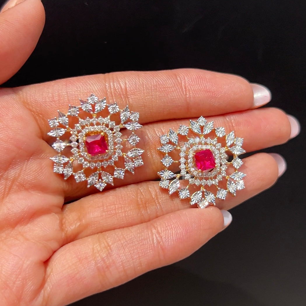 These luxurious studs feature a vivid cushion-cut ruby at the center, encircled by a lavish double halo of brilliant-cut diamonds. Designed in an intricate floral motif, the arrangement of diamonds creates a sparkling burst effect, perfectly balancing opulence and elegance. The combination of fiery red and dazzling white stones makes these earrings a timeless statement piece for special occasions.