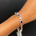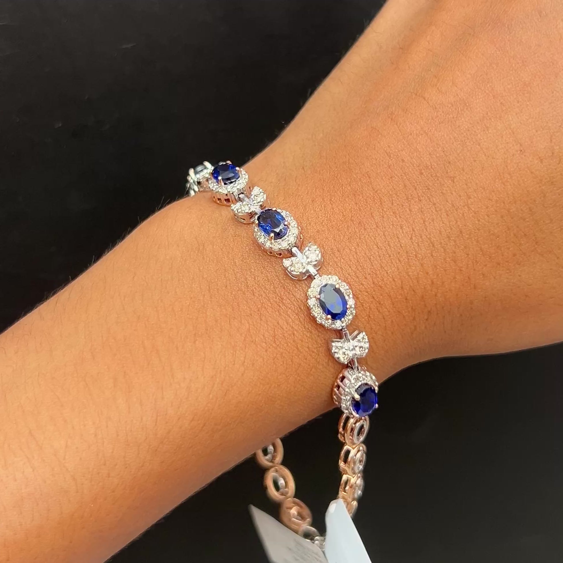 An ode to regal grace, the Royal Bloom Sapphire Diamond Bracelet showcases a line of vivid oval-cut blue sapphires, each haloed by shimmering diamonds. Delicate diamond-studded floral motifs sit gracefully between each sapphire, adding a touch of softness to its royal charm. Crafted in white gold, this elegant piece blends classic gemstone beauty with intricate craftsmanship — perfect for both grand occasions and refined everyday glam.