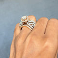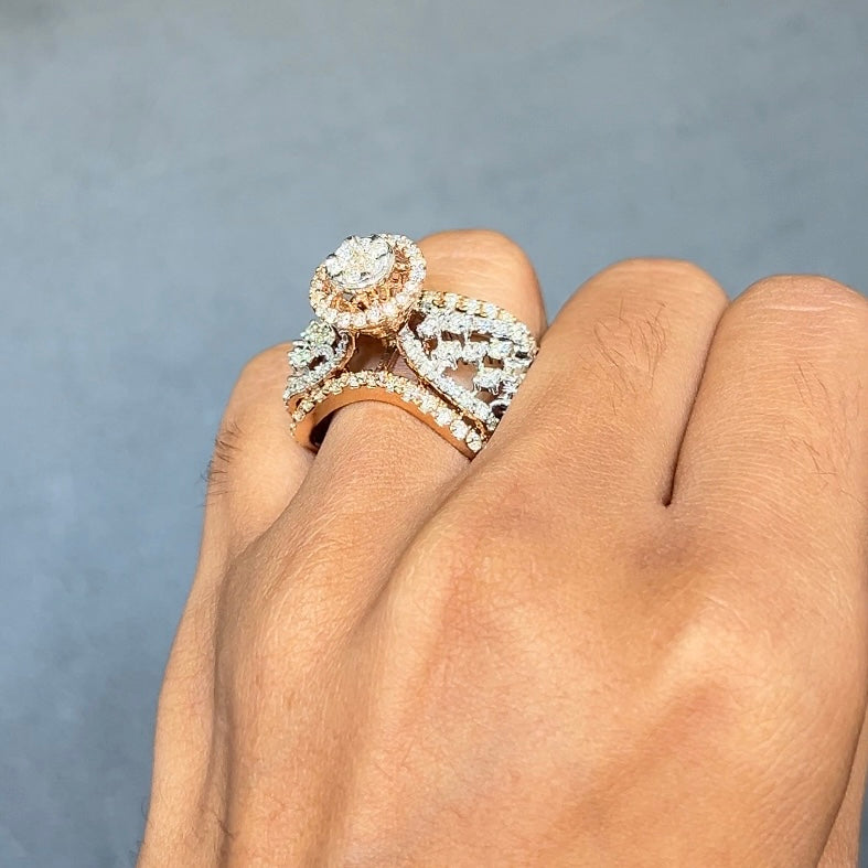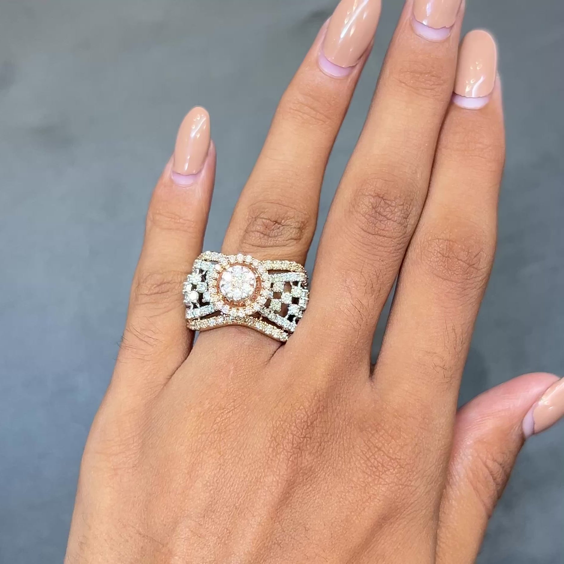 This statement-making diamond ring is designed with a majestic appeal, featuring a brilliant round-cut center diamond encircled by a shimmering halo. The intricate lattice-style band is richly adorned with multiple rows of pavé-set diamonds, creating a bold and luxurious look. The subtle touch of rose gold around the centerpiece enhances contrast and adds warmth to the dazzling white brilliance. Perfect for brides who desire a regal, show-stopping design.