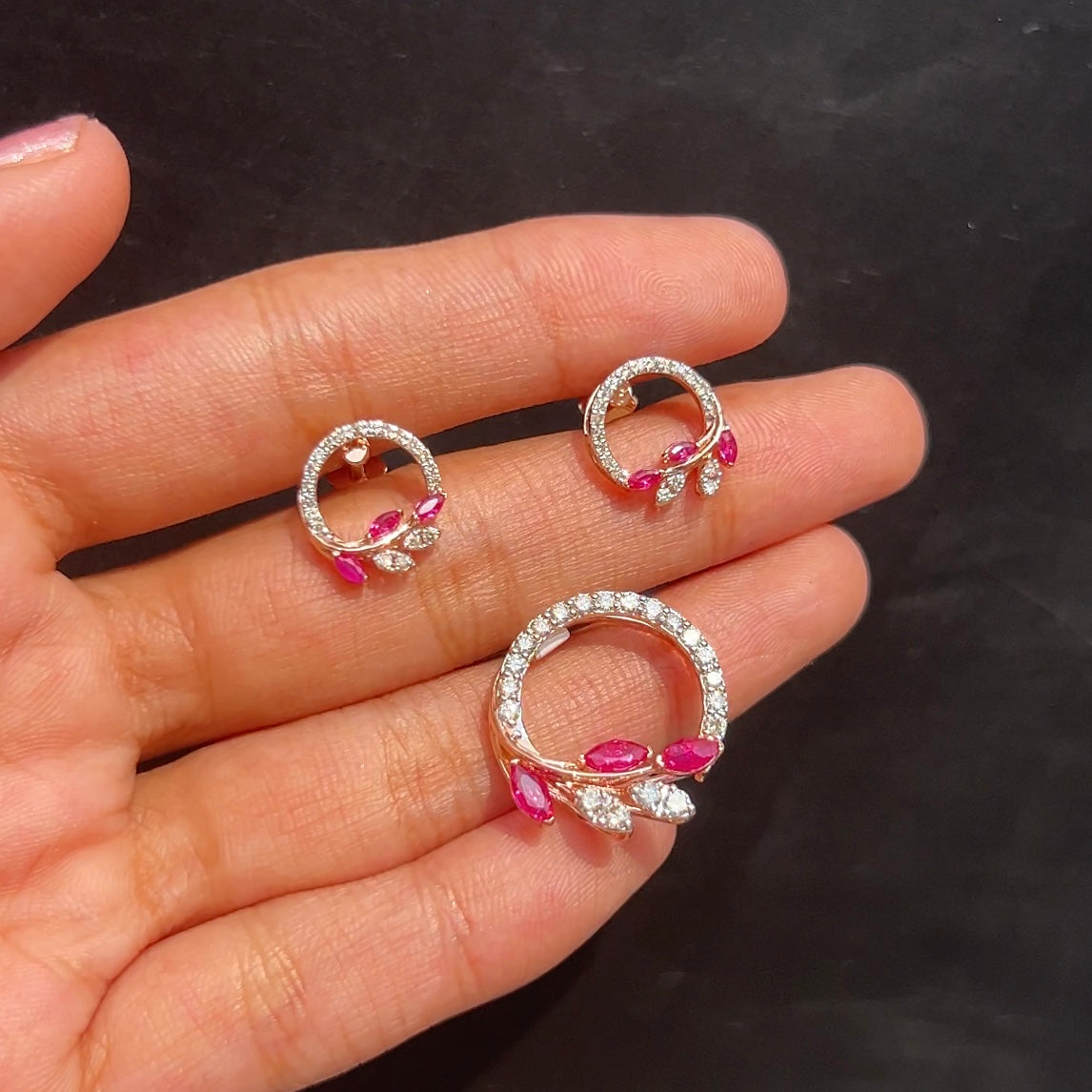 Delicate yet dazzling — the Ruby Bloom Diamond Pendant Set capture the essence of modern elegance. Crafted in a graceful circular silhouette, these earrings and pendant feature marquise-cut rubies and sparkling natural diamonds entwined like blooming petals. Set in 14Kt hallmarked gold, they radiate charm and sophistication — perfect for adding a hint of color and sparkle to your everyday or festive look.