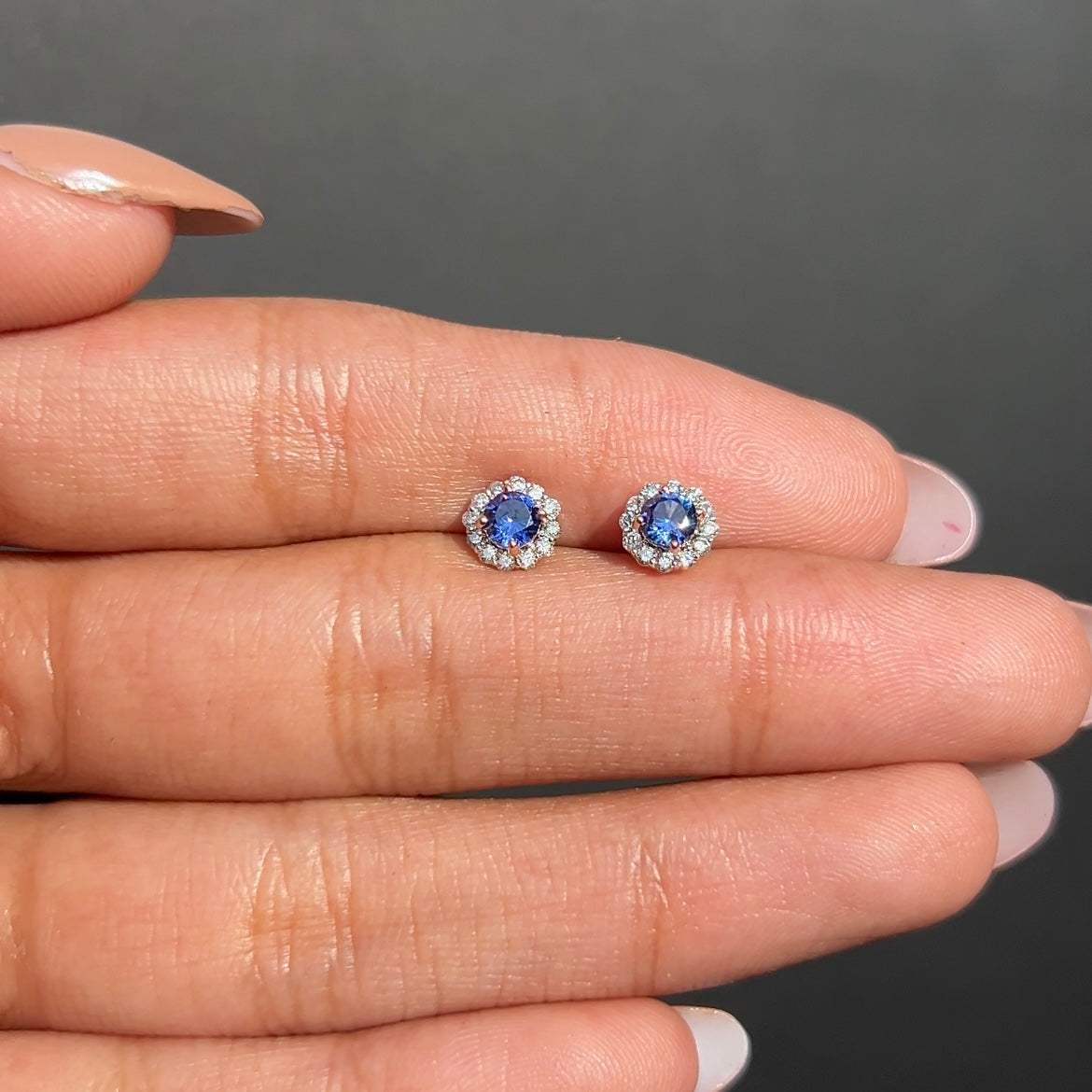 A timeless blend of elegance and sparkle, these stud earrings feature vivid blue sapphires at the center, surrounded by a halo of shimmering white diamonds. Perfect for everyday wear or special occasions, they add a pop of color and a touch of luxury to any outfit.