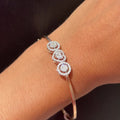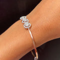 Celebrate elegance in threes with the Trio Radiance Diamond Bracelet, featuring a graceful alignment of three diamond-studded motifs — round, heart, and circle — each surrounded by a shimmering halo. Set on a sleek, high-polished gold bangle, this piece captures timeless charm with a contemporary twist. Perfect for both everyday luxury and statement occasions.